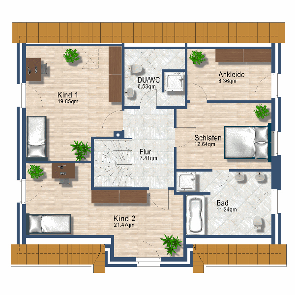 - Wahlweise kann eine große, offene Galerie bis zum Obergeschoss oder ein zusätzliches Zimmer im Giebel geplant werden